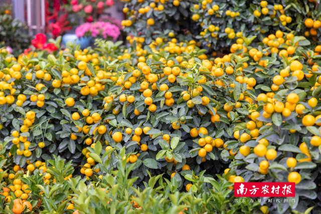 年桔又称金桔,是中国人春节的吉祥树,也是广东花卉中最受欢迎的品种。在粤语中,“桔”与“吉”同音,因此,年桔又被讲意头的广东人赋予了“大吉大利”等寓意。每逢春节前夕,广东各地的花卉市场、迎春花市都会迎来挑选桔树的赏花客,讲究的广东人还会在年桔树上挂满利是封,放在家中阳台、客厅等地方,寓意开门大吉。