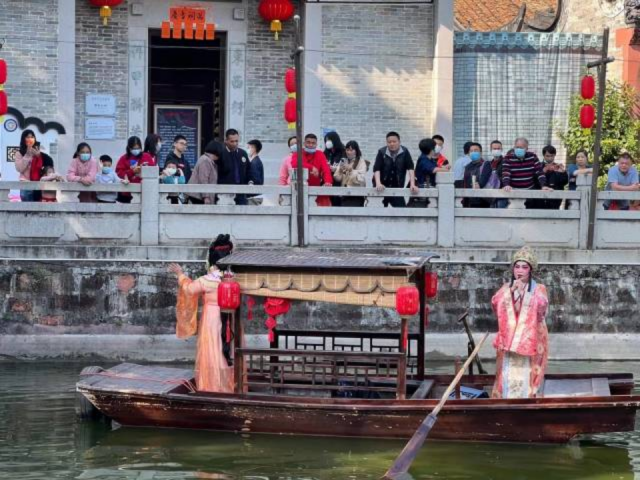 新春佳节,走进东莞市茶山镇南社古村,浓郁的年味扑面而来。古村落的民居小道上挂满了大红灯笼,“招财兔”和“财神爷”正在桥头送祝福;身着传统戏服的粤剧演员站立在船头上,为游客们献上贺岁大戏;丰收农耕队员穿着农服、抬着农具,沿着古村落的民居小道巡游,祝愿新的一年风调雨顺、五谷丰登…