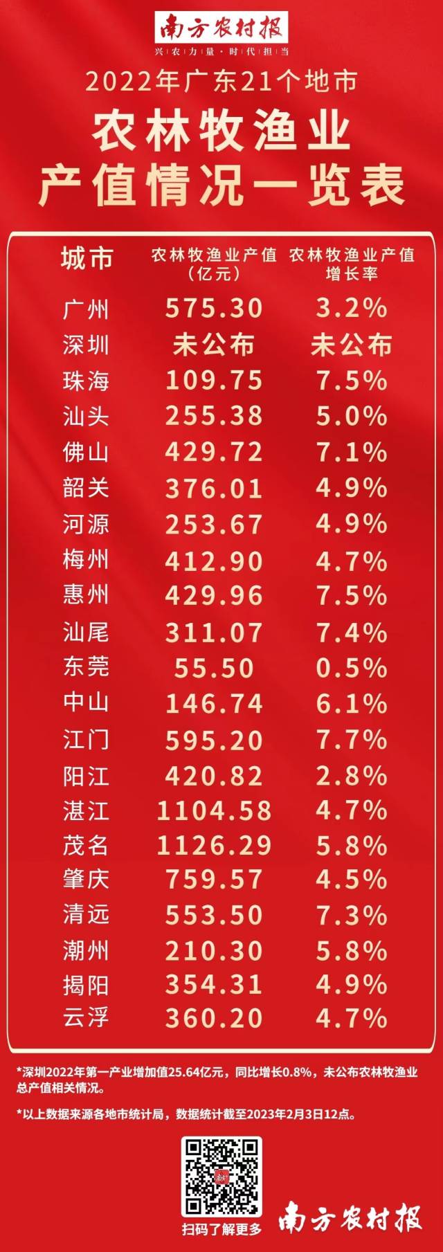 2月2日,阳江、揭阳两地统计局分别发布2022年全市经济运行情况。截至目前,除深圳市统计局的经济运行情况未公布农林牧渔业生产发展情况外,广东其余20个地市的地区生产总值、农林牧渔业产值等情况已全部公布。