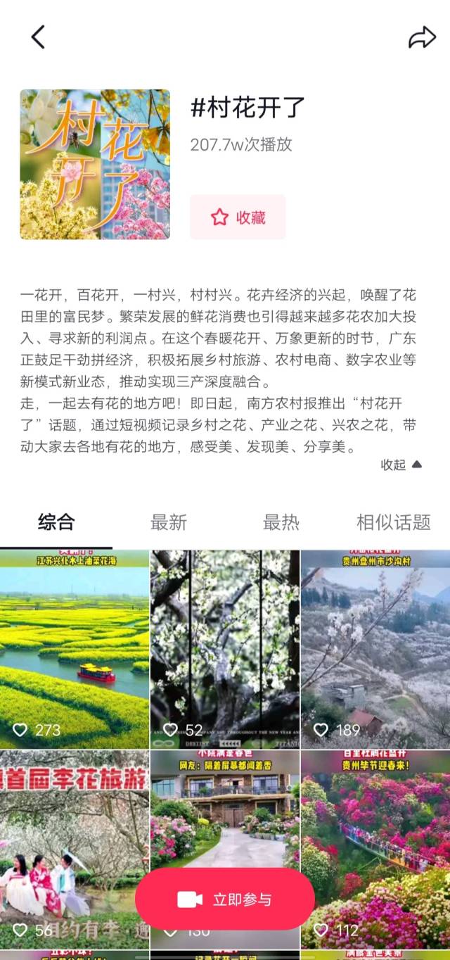 春风过处,花开烂漫。日前,由南方农村报联合抖音推出的#村花开了#话题在抖音平台热度持续高涨,吸引了众多热爱赏花、热爱生活的网友晒出身边的美丽。据统计,#村花开了#话题上线两周,播放量已突破200万次。