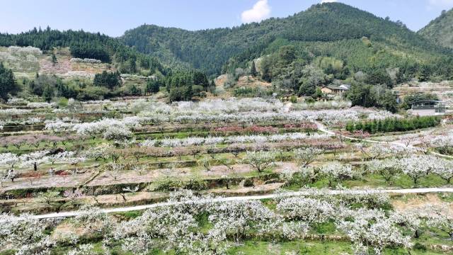白白与红红,别是东风情味。曾记,曾记,人在乐昌微醉。乐昌花海中,桃花最出名,李花最多。乐昌黄金柰李从上世纪90年代引种以来,短短三十年就成了当地最重要的经济作物之一,种植面积和产量牢牢占据了当地水果中的头把交椅。李花怒放一树白,遥望疑是春飞雪,广东的冬天不下雪,但这里的春天可“赏雪”。