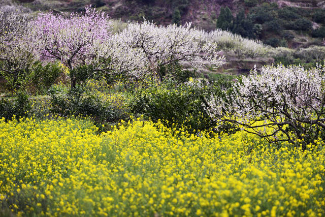 乐昌每年都会给果农分发油菜种子,等开花结籽之后还田当做绿肥,给桃李提供营养,兀自应了龚自珍的那句“落红不是无情物,化作春泥更护花”。桃花、李花、油菜花本来花期相近,三花盛放,填满了整个乐昌的春天。