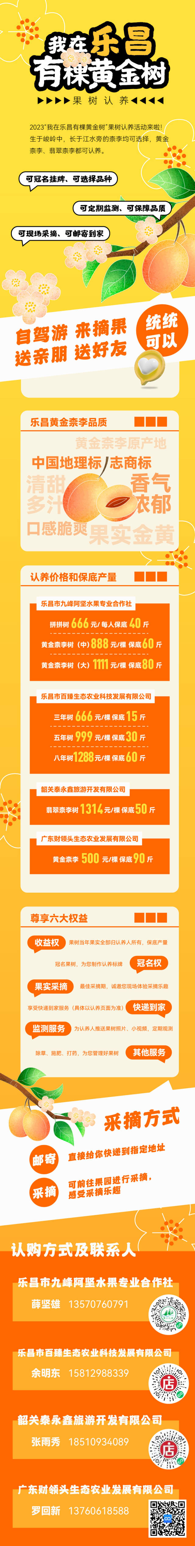2023年,“我在乐昌有棵黄金树”认养活动再升级,九峰镇、梅花镇、庆云镇等多个主产区全面参与,乐昌市九峰阿坚水果专业合作社、乐昌市百臻生态农业科技发展有限公司、韶关泰永鑫旅游开发有限公司、广东财领头生态农业发展有限公司等提供优质果树。不管是在山上,还是在江边;不论是黄金柰李,还是翡翠柰李,都能在这里选择。活动也根据品种、树龄、产量等不同特点,定下不同的认养价格。