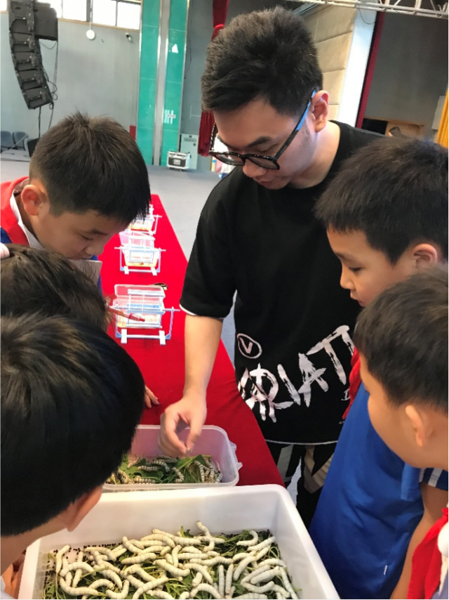 课堂上,同学们纷纷举手发言,提出“不同斑纹体色的蚕会不会吐出不同颜色的丝?”“怎样才能养出白白胖胖的蚕宝宝?”“蚁蚕会不会吐丝?”等问题,展现出学生们对蚕宝宝和养蚕的浓厚兴趣。此外,科研人员还展示了虎斑、多星斑等斑纹蚕,示范了手工缫丝。