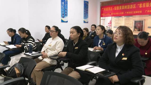 镇宁自治县毗邻黄果树旅游区,近年从广东过来旅游的游客日渐增多。为提升当地酒店服务水平和粤菜烹饪能力,越秀区带来了“客房服务员”师资培训和“广府风味菜烹饪”专项职业能力培训2个培训项目。培训班由广州岭南商旅投资集团有限公司和广州市轻工技师学院联合共同授课,上课的老师分别由五星级大酒店资深管理导师、星级粤菜师傅、世界技能大赛导师等担任。