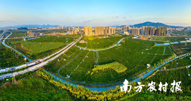 郁郁葱葱的柑园和远处林立的高楼,正是新会区全力推动新会陈皮现代化产业体系建设,推动城乡区域协调发展的真实写照(图:甄锦超摄)