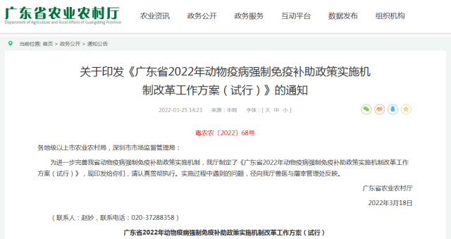 近日,广东省农业农村厅发布《广东省动物疫病强制免疫补助政策改革实施方案》。《方案》提出,从2023年5月1日起,全省所有规模养殖场户自主采购疫苗、自行开展免疫、免疫合格后申请补助(以下简称“先打后补”),政府招标采购强制免疫疫苗停止供应规模养殖场户。规模养殖场户标准按照《广东省农业农村厅种畜禽生产经营许可证发放和畜禽养殖备案办法》(粤农农规〔2019〕10号)执行。