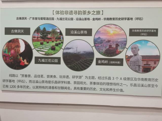 为借助茶文化促进农旅融合发展,本次茶文化节还发布了韶关8县(市、区)的茶旅精品线路,乐昌的“体验非遗寻韵茶乡之旅”以“赏春景、品佳茗、尝美食、玩非遗、研学游”为主题,线路串联了古佛洞天、九福兰花公园、金鸡岭3个A 级景区以及华南教育历史研学基地(坪石)、沿溪山茶场,一路上可以欣赏到乐昌优美的生态自然风光、感受深厚的文化底蕴、体验非遗制茶茶工艺等,让乐昌深厚的茶文化进一步融入到旅游活动当中,以茶助旅、以旅带茶。