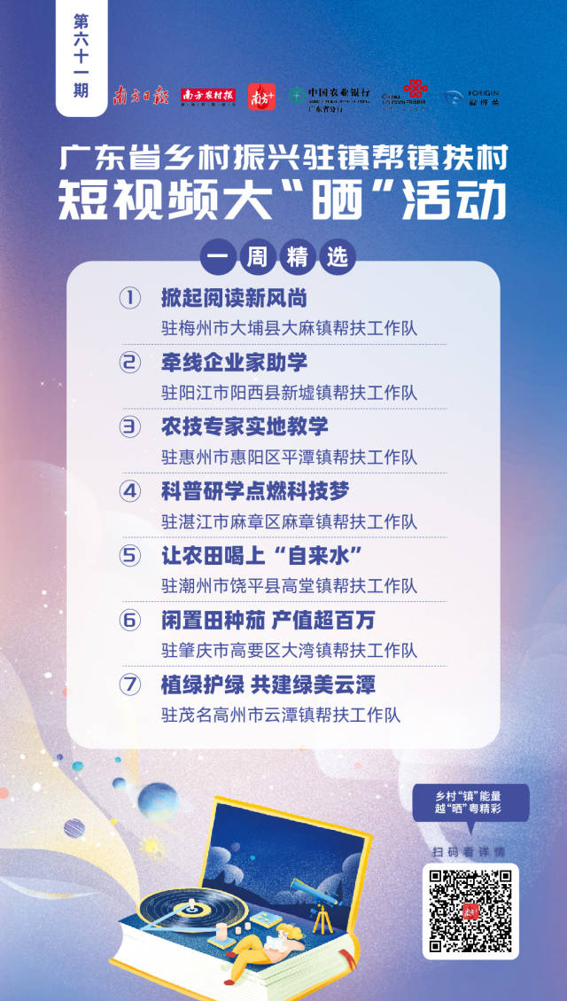 以“乡村‘镇’能量,越‘晒’粤精彩”为主题的广东省乡村振兴驻镇帮镇扶村短视频大“晒”活动于2022年2月全面启动。活动在南方+APP开辟专区,鼓励各驻镇帮扶工作队比“晒”行动做法、成效亮点、实事好事。主办方每周将精选出部分优秀参“晒”作品进行展播。无论是晒工作经验做法,还是秀驻镇风采人物趣事,均有机会上榜驻镇帮镇扶村短视频大“晒”一周精选,敬请垂注!