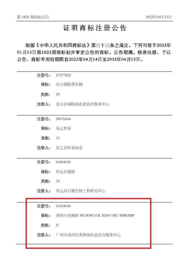记者也从国家知识产权局商标局中国商标网所发布的公告中看到,注册号为60334039的商标“黄阁小虎麻虾HUANG GE XIAO HU SHRIMP”初步审定公告期满,核准注册,商标专用权期限自2023年04月14日至2033年04月13日。