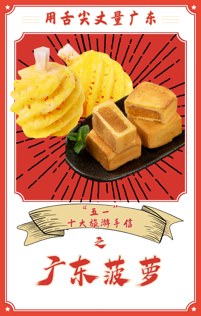 近年来,广东大力发展鲜切菠萝,将更方便吃的菠萝送达消费者。撕开包装,免泡盐水,直接食用,浓浓的甜味儿。此外,还有冻干菠萝脆片、菠萝干、菠萝果粉、菠萝罐头和凤梨酥等深加工产品,口感丰富,值得一试。