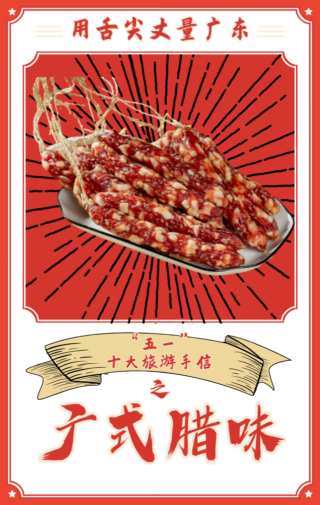 广式腊味有腊肠、腊肉、腊鸭和腊鹅产品。制作手法上面十分精细,对温度、湿度、水分和食盐含量、肥瘦比例、晾晒时间等方面都有着严格标准,让人惊叹老广们炉火纯青的技艺。
