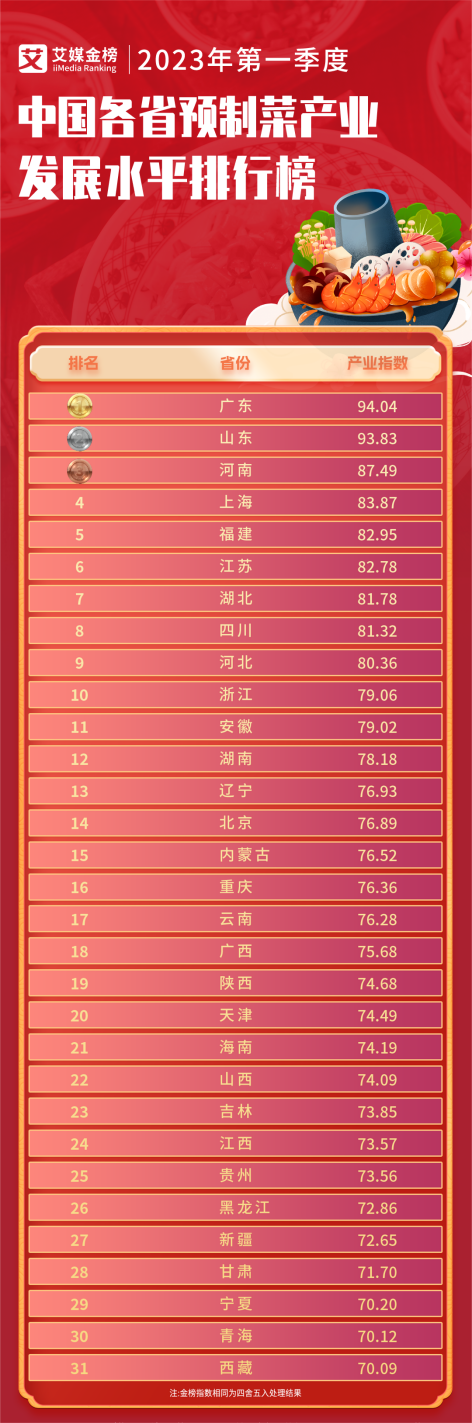 近日,艾媒金榜发布《2023年第一季度中国各省预制菜产业发展水平排行榜》。榜单显示,2023年第一季度中国各省预制菜产业发展水平前10名分别为:广东、山东、河南、上海、福建、江苏、湖北、四川、河北、浙江。值得注意的是,与《2022年度中国各省预制菜产业发展水平排行榜》相比,前三名省份仍是广东(94.04)、山东(93.83)、河南(87.49),上海(83.87)升至第四名。