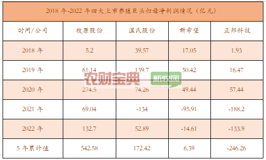 据农财宝典新牧网记者统计,从过去5年累计的归母净利润的维度看,牧原、温氏和新希望的累计归母净利润依然为正,牧原的5年累计利润甚至超过了540亿元,而正邦科技受过去两年连续大幅亏损影响,5年累计净利润已经亏损246亿元。