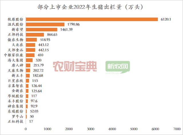 养猪企业肯定要先看出栏量。据农财宝典新牧网记者整理统计,21家上市猪企2022年的生猪出栏量高达1.38亿头。按照2022年全国出栏生猪7亿头计算,这21家企业占了全国出栏量将近20%。