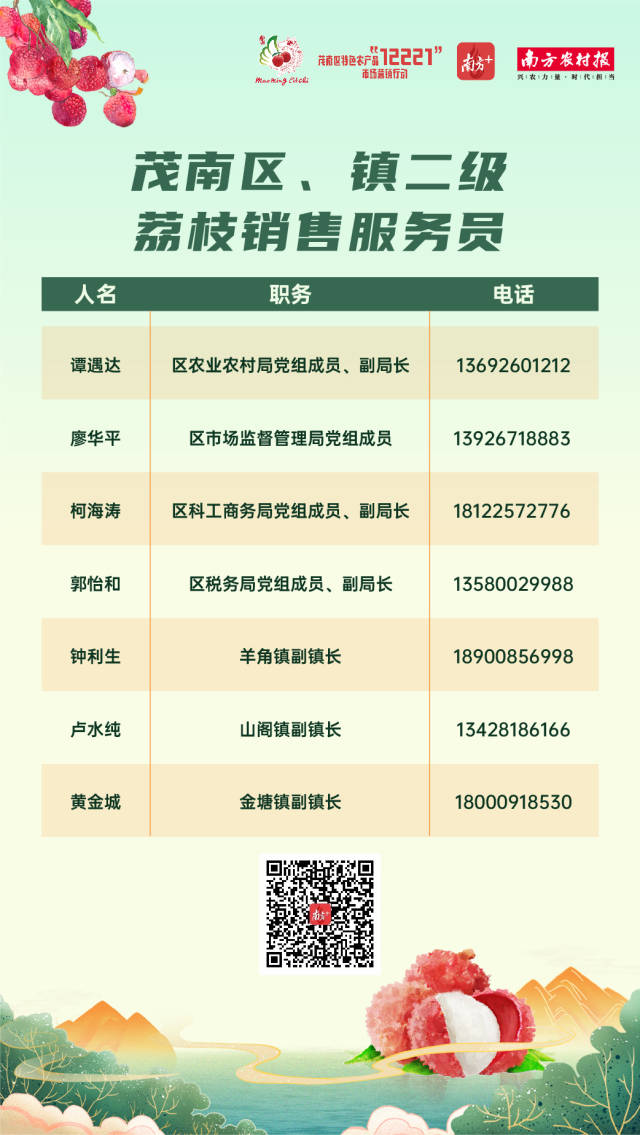 为奋力吹响2023年茂南荔枝市场“营销战”冲锋号,扎实做好今年茂南荔枝营销系列行动,近日,茂南区和荔枝主产地区(羊角镇、金塘镇、山阁镇)联合市场监督、商务、税务、农业农村等有关部门,原创发布《茂南荔枝采购指南》,宣布成立区、镇二级荔枝购销服务中心,要求做到上班时间有人在岗、下班时间电话在线,对购销商的需求及时响应并积极解决。