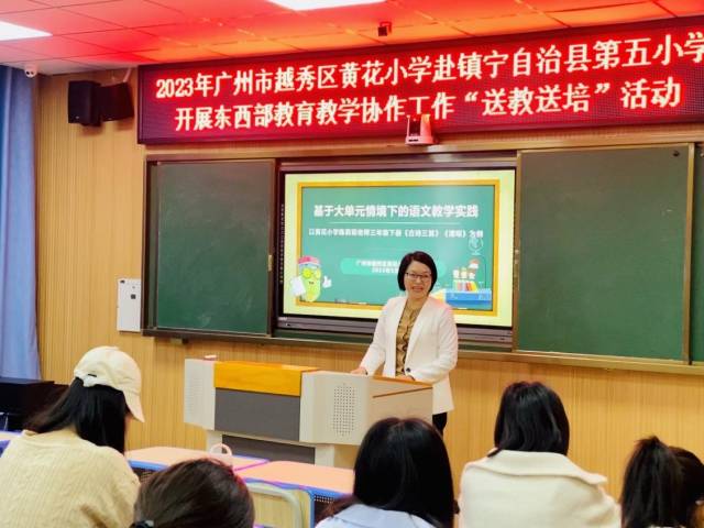 次日,何妙婉副校长和镇宁五小教师们进行了“新课标大单元情境下的教学实践”主题交流,何校长以黄花小学教师的语文大单元课例为切入点,从“创设大情景、创设大任务、开展学习活动”三方面分享多年教学实践经验,为镇宁五小老师们带来启迪和感悟。