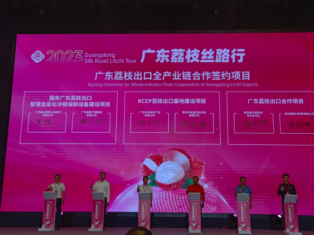 以“荔”会友,惠州荔枝企业在“荔枝丝路”上还收获了海外的项目。专做水果出口的贸易企业惠州亨达利农业开发有限公司与广州市荔鼎生态农业开发有限公司签订了收购荔枝出口东南亚协议,协议金额达1500万元;惠州市果皇农业科技有限公司与广东泽丰园农产品有限公司签订RCEP荔枝出口基地建设项目。