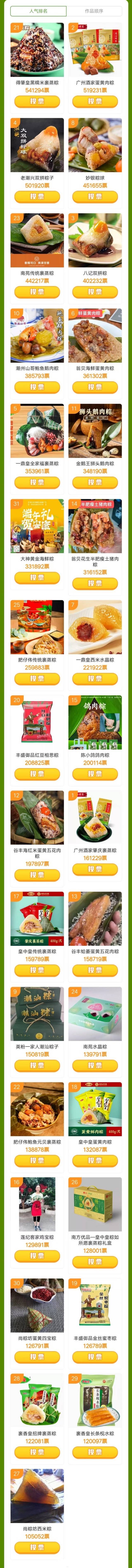 值得一提的是,线上投票只占综合评分的30%。投票环节结束后,还将由政府、媒体等相关领域的专家人员组成线下评审团,为参赛粽子打分,满分100分,占综合评分70%。最终统计线上投票和线下评审的综合得分,评选出广东十大美味粽王和广东十大创新粽王,于6月初在平台上进行公示。