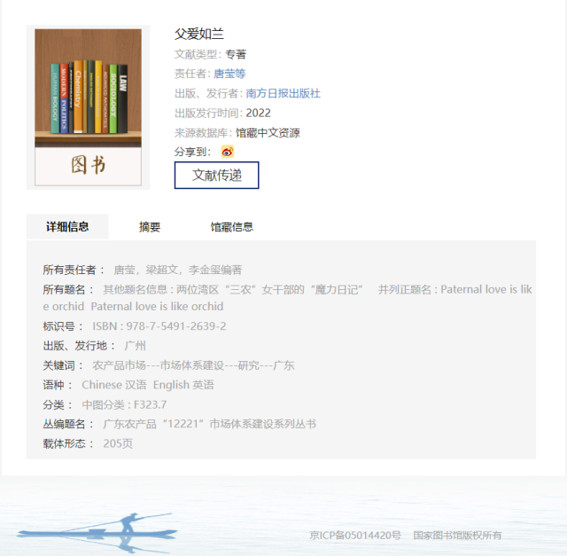 近日,《父爱如兰》被清华大学、北京大学、中国农业大学等多所高校图书馆及国家图书馆收录馆藏。该书是由两名湾区“三农”女干部以日记形式真实记录了广东把兰花打造成为父亲节节礼,带领花农在疫情防控期间创新营销形态,在本是淡季的6月份把兰花滞销变热卖,打响区域特色产业品牌,带动花农增收致富的故事。父爱如兰,从理念到实践,堪称文化赋能农业品牌,节庆经济助力乡村振兴的“拍案惊奇”。