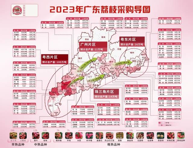 点击“游园采荔”板块,可以看到由广东省农业农村厅编制的《2023年广东荔枝采购导图》,详细的标注了今年广东荔枝种植生产情况、主要品种上市时间、特色产区、区域公用品牌产品供应标准、出口国家和地区等情况。在“云上农展”平台不仅可以买广东荔枝,还可通过各功能板块了解广东荔枝的最新资讯、主要产区、品种科普知识等精彩内容。