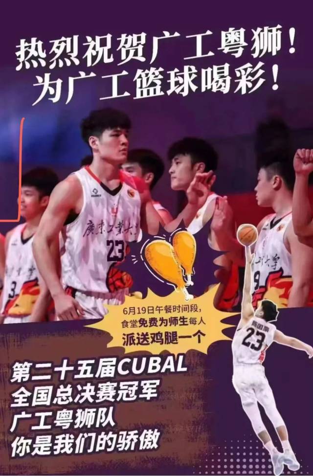 当晚,#广工总冠军 话题登上热搜第一,广工校内也早已沸腾成一片海洋。为了庆祝获得总冠军,6月19日中午,广东工业大学食堂准备了5万个鸡腿向师生免费派送,祝贺广工男子篮球获得全国总冠军。