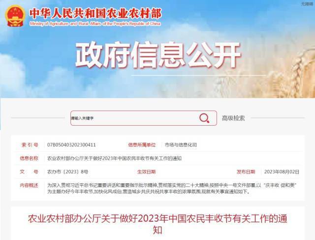 中国农民丰收节是党中央批准、国务院批复,第一个在国家层面专门为农民设立的法定节日。为办好今年丰收节,加快化风成俗,营造城乡共庆共祝共享丰收的浓厚氛围,农业农村部办公厅8月2日印发《关于做好2023年中国农民丰收节有关工作的通知》。