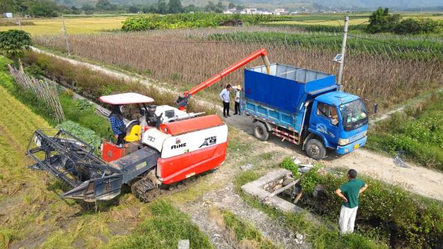 农民们忙着运送稻谷,看着刚收下的稻谷在车厢里堆成小山包,种植大户林先生露出欣慰的笑容说:“晚稻共种了30多亩,由于品种选得好,天气适宜,县镇技术专家经常来指导,晚稻得了大丰收,共收了6万多斤稻谷。”