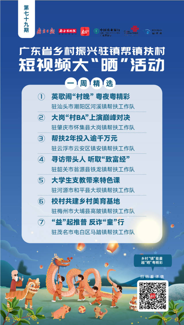 以“乡村‘镇’能量,越‘晒’粤精彩”为主题的广东省乡村振兴驻镇帮镇扶村短视频大“晒”活动于2022年2月全面启动。活动在南方+APP开辟专区,鼓励各驻镇帮扶工作队比“晒”行动做法、成效亮点、实事好事。主办方每周将精选出部分优秀参“晒”作品进行展播。无论是晒工作经验做法,还是秀驻镇风采人物趣事,均有机会上榜驻镇帮镇扶村短视频大“晒”一周精选,敬请垂注!