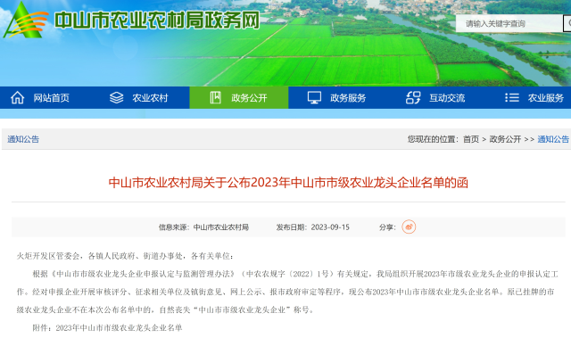 黄圃镇入选2023年中山市市级农业龙头企业名单