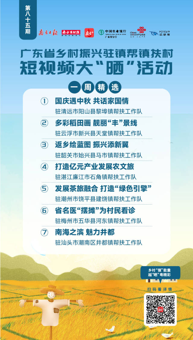 以“乡村‘镇’能量,越‘晒’粤精彩”为主题的广东省乡村振兴驻镇帮镇扶村短视频大“晒”活动于2022年2月全面启动。活动在南方+APP开辟专区,鼓励各驻镇帮扶工作队比“晒”行动做法、成效亮点、实事好事。主办方每周将精选出部分优秀参“晒”作品进行展播。无论是晒工作经验做法,还是秀驻镇风采人物趣事,均有机会上榜驻镇帮镇扶村短视频大“晒”一周精选,敬请垂注!