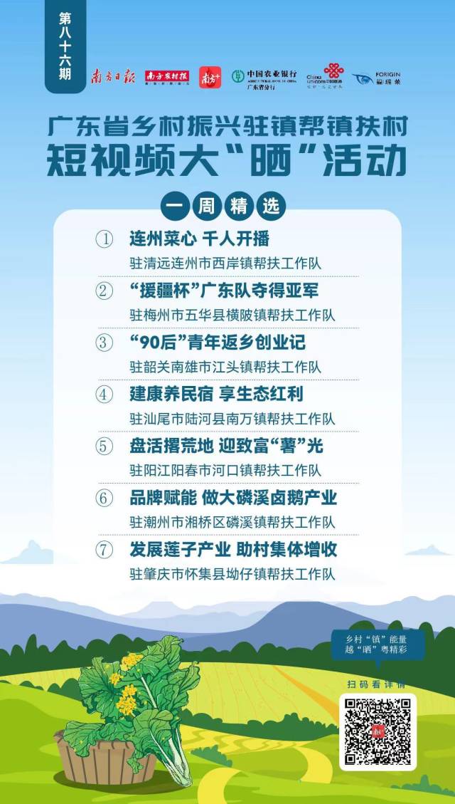 以“乡村‘镇’能量,越‘晒’粤精彩”为主题的广东省乡村振兴驻镇帮镇扶村短视频大“晒”活动于2022年2月全面启动。活动在南方+APP开辟专区,鼓励各驻镇帮扶工作队比“晒”行动做法、成效亮点、实事好事。主办方每周将精选出部分优秀参“晒”作品进行展播。无论是晒工作经验做法,还是秀驻镇风采人物趣事,均有机会上榜驻镇帮镇扶村短视频大“晒”一周精选,敬请垂注!
