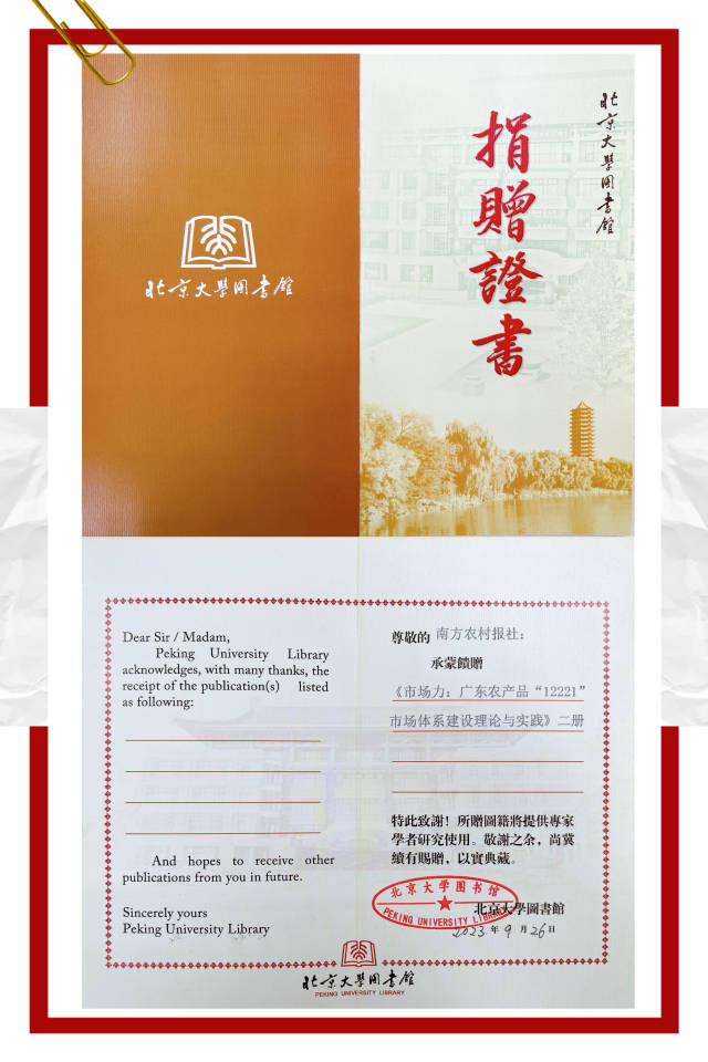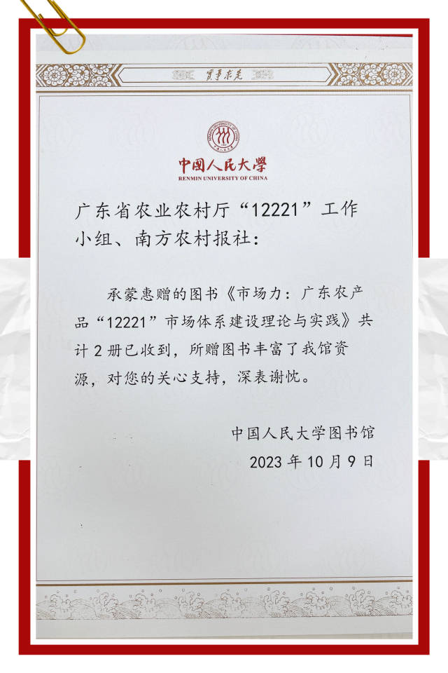 近日,《市场力:广东农产品“12221”市场体系建设理论与实践》(以下简称为《市场力》)被北京大学、清华大学、中国人民大学、中国农业大学四所著名高校图书馆收录馆藏。北京大学表示,该书将提供专家学者研究使用。