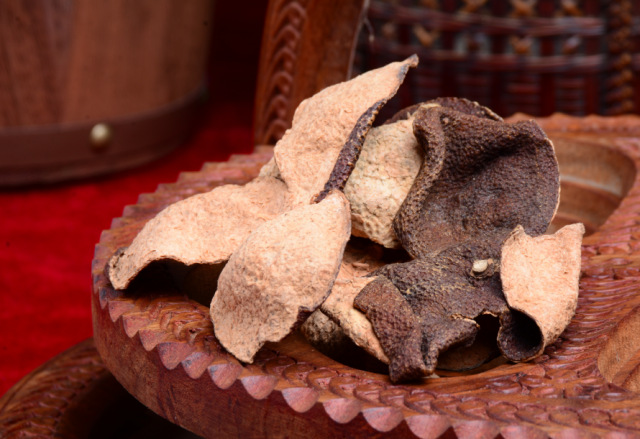 一两陈皮一两金,百年陈皮胜黄金。江门新会的茶枝柑是制作陈皮的唯一原料,早在明清以前就已蜚声遐迩,被列为“贡品”。不同时期的新会柑,能衍化成不同的产品。八九月摘“小青柑”,填满普洱茶,晒干便是小青柑茶;时下黄绿相间的“二红柑”,成熟度刚好,用以晒陈皮;而12月采摘的“大红柑”,是制成陈皮的最贵原料。