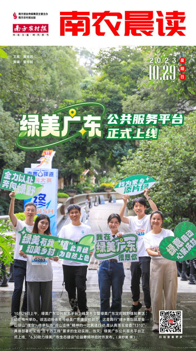 10月29日上午,绿美广东公共服务平台上线发布会暨绿美广东定向越野体验赛活动在梅州举办。活动将体育与绿美广东建设相融合,传承弘扬“岳山造林”精神,认真落实省委“1310”具体部署和实施“百千万工程”的有关要求,正式上线绿美广东公共服务平台,发布了“6.30助力绿美广东生态建设”公益募捐项目,进一步凝聚绿美广东生态建设的强大力量。现场600多名绿美广东定向越野活动参与者纷纷响应号召,积极参与“6.30助力绿美广东生态建设——我为家乡添片绿”活动,积极认捐认养,践行爱绿植绿护绿,共建共享绿美广东生态建设成果。