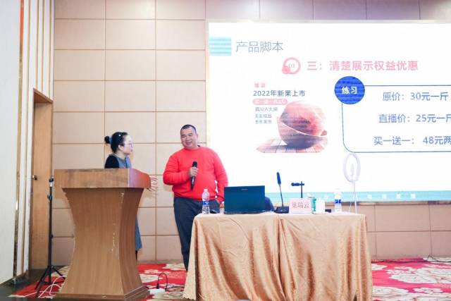 “原价30元一斤,直播价25元一斤,买一送一48元两斤!”尽管初上台的学员有些紧张,但在讲师的耐心指导下,逐渐自信地对着镜头大声吆喝起来,赢得现场掌声一片。对于如何练好直播的镜头感,巢瑞云建议多进行面部肢体与声音训练。“大家可以每天找点新闻或者直播稿子对着手机原相机录屏,每天1分钟,坚持1个月,反复练习,对比结果,不断优化。”她鼓励道。