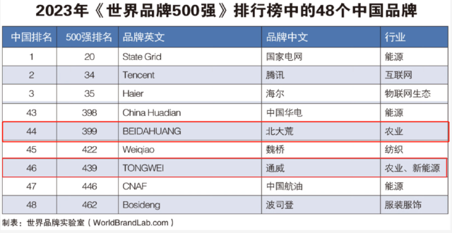12月13日,由世界品牌实验室独家编制的2023年度(第二十届)《世界品牌500强》排行榜在美国纽约揭晓。中国品牌入选数(48个)首次超越日本(43个),跃居全球第三。榜单显示,中国2个农业品牌入选世界品牌500强,其中,北大荒排名第399位,通威排名第439位。