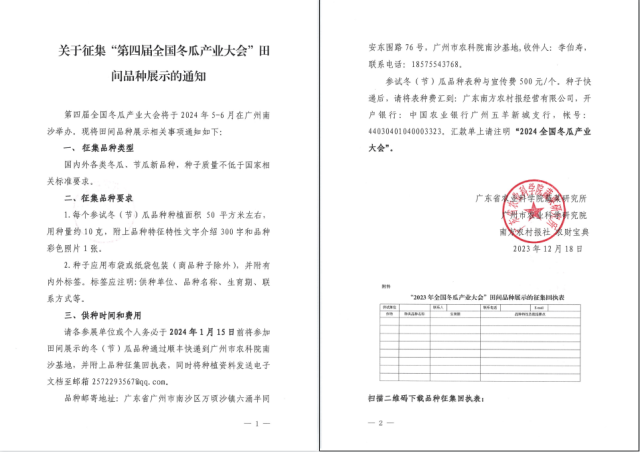 请各参展单位或个人务必于2024年1月15日前将参加田间展示的冬(节)瓜品种通过顺丰快递到广州市农科院南沙基地,并附上品种征集回执表,同时将种植资料发送电子文档至邮箱2572293567@qq.com。