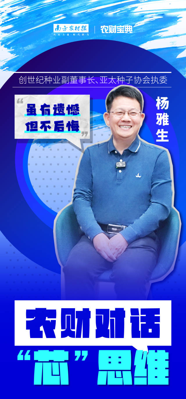 写在文末:对于过去,杨雅生有成功有失败,有遗憾但不后悔。关于当下和未来,他还有很多想做的事、未竟的梦。杨雅生说,自己有两家种业公司的经营经验和教训,未来希望可以跟业内人士多交流探讨,如果能让大家汲取一些有用的信息,有所帮助和收获,将是一种心愿和欣慰!业内也非常期待,以后可以常常听到他的声音。