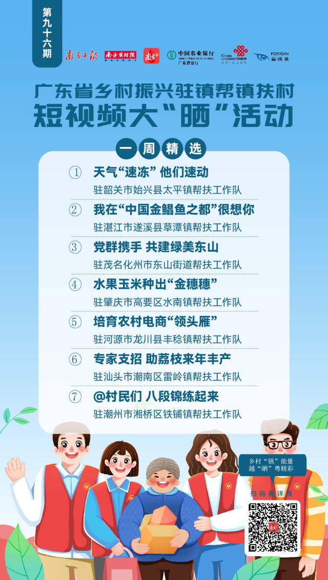 以“乡村‘镇’能量,越‘晒’粤精彩”为主题的广东省乡村振兴驻镇帮镇扶村短视频大“晒”活动于2022年2月全面启动。活动在南方+APP开辟专区,鼓励各驻镇帮扶工作队比“晒”行动做法、成效亮点、实事好事。主办方每周将精选出部分优秀参“晒”作品进行展播。无论是晒工作经验做法,还是秀驻镇风采人物趣事,均有机会上榜驻镇帮镇扶村短视频大“晒”一周精选,敬请垂注!