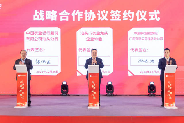 为更好整合资源,汕头市农业龙头企业协会与汕头市农副产品冷链流通协会、汕头市狮头鹅产业协会、汕头预制菜产业联合会,汕头市水产协会、农业银行汕头分行、中国移动汕头分公司等协会代表和企业代表进行战略合作签约仪式,推动更多合作落地生根。