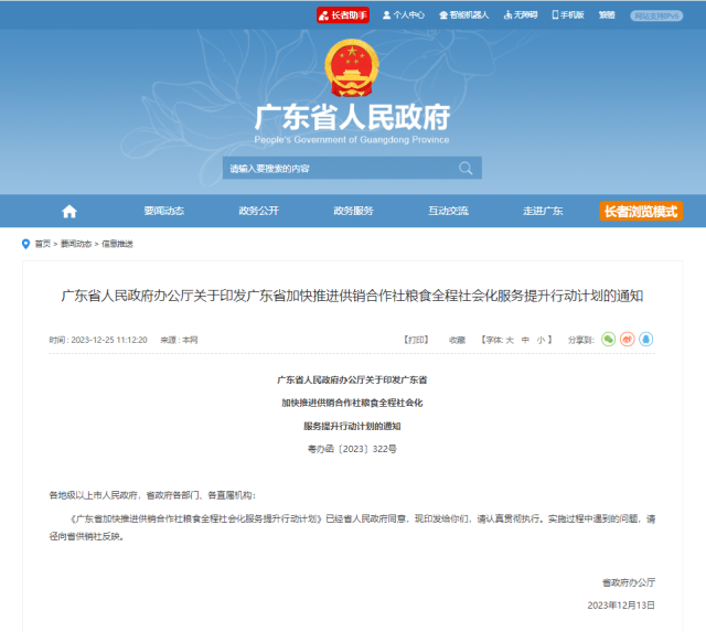 12月25日,广东省人民政府办公厅网站发布《广东省加快推进供销合作社粮食全程社会化服务提升行动计划》(以下简称《计划》)。《计划》聚焦绿色农资保供稳价、粮食产业社会化服务、粮食产业融合发展、粮食全产业链数字化、联农带农组织化合作化、加强工作保障六大方面,旨在发挥供销合作社服务粮食安全的重要作用,助力粮食增产、农民增收、产业增效。
