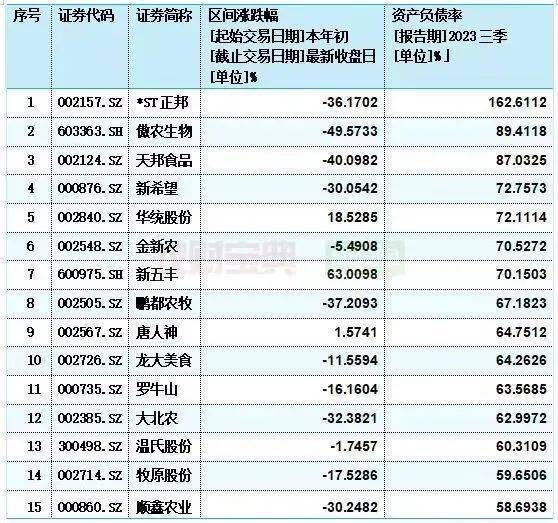 但在行情堪忧的当下,即便是巨头也需要审慎考虑自身的资金风险。大北农傲农联姻最终就因为傲农股权司法冻结的问题告吹。2024年,巨头继续整合的趋势仍在。毕竟从农财智库整理的2023第三季度上市猪企负债表来看,负债率高于平均值的很多企业仍然压力山大。2024年新的巨头整合中,他们将大概率成为主角。