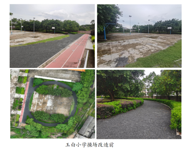 工作队在前期走访调研中发现,作为现有师生360余人的村级公办学校,玉白小学原有篮球场缺少打理,年久失修,设施破败,操场跑道为煤渣碎石粉地面,坑洼松软,在有风的时候,漫天尘土飞扬,对在校学生身心健康产生极大危害,影响学校正常、安全开展体育锻炼活动,亟须改造升级。为此,工作队协同桂岭镇委镇政府,设立帮扶专项,积极筹划,对接社会资源,联动广州市东升公益基金会、广东信宏智慧建造工程有限公司共捐资80万元推动玉白小学操场升级改善项目顺利实施。