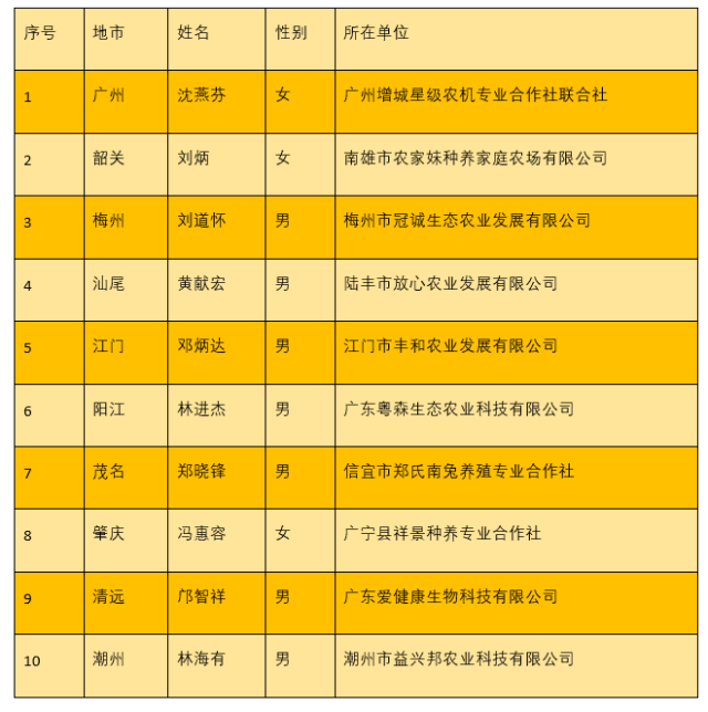 2023年“广东省十大杰出高素质农民”结果正式公布。十位杰出的农民来自广东省的十个不同城市,其中既有坚定回乡建设的90后“新农人”,也有坚守农业岗位多年的资深人士。他们因坚守农业初心,牢记农业使命,在众多农民中脱颖而出,成为了高素质农民的典范。