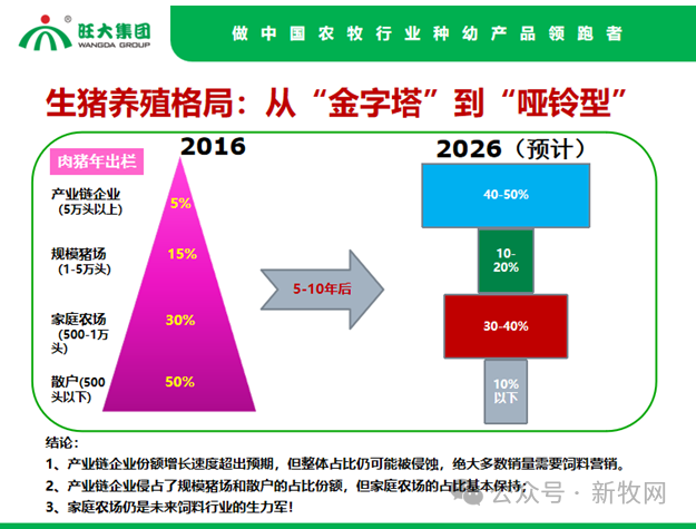 “未来生猪养殖格局将从‘金字塔’型变成‘哑铃’型,饲料产业格局将随之变化。”广东旺大集团股份有限公司(以下简称“旺大集团”)董事长钟世强在《举什么旗,走什么路?》的报告分享中提到,国内养殖格局和竞争格局深度变化,既是危机,又是机会。