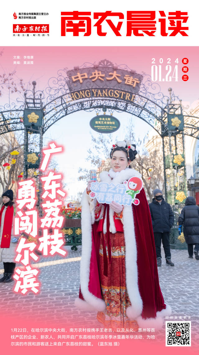 1月22日,在哈尔滨中央大街,南方农村报携手王老吉,以及从化、惠州等荔枝产区的企业、新农人,共同开启广东荔枝哈尔滨冬季冰雪嘉年华活动(下称“嘉年华”),为哈尔滨的市民和游客送上来自广东荔枝的甜蜜。>