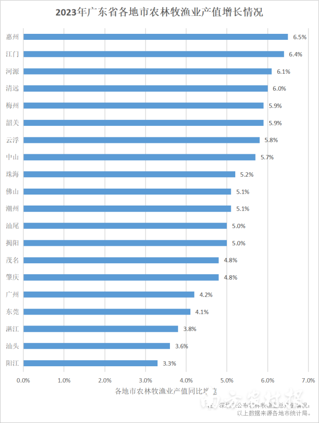 据统计,2023年,广东省农林牧渔业总产值0.92万亿元,同比增长5.0%。从农林牧渔业产值增速来看,珠海、佛山、韶关、河源、梅州、惠州、汕尾、中山、江门、清远、潮州、揭阳和云浮13个地市“跑赢”全省平均水平,15个地市的农林牧渔业产值增速超过了当地生产总值的增速。