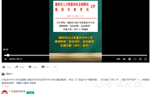 “在农村中小学任教累计满25年且仍在农村中小学任教的教师,可直接申报副高级职称!”近日,这样一条消息刷屏了揭阳人朋友圈,该消息来源于揭阳市人力资源和社会保障局、揭阳市教育局联合印发《揭阳市2023年度农村中小学教师职称“定向评价、定向使用”实施方案(试行)》,该《方案》适用于揭阳市农村中小学(含幼儿园、特殊教育学校)在职在岗且在农村中小学任教累计满25年的教师。