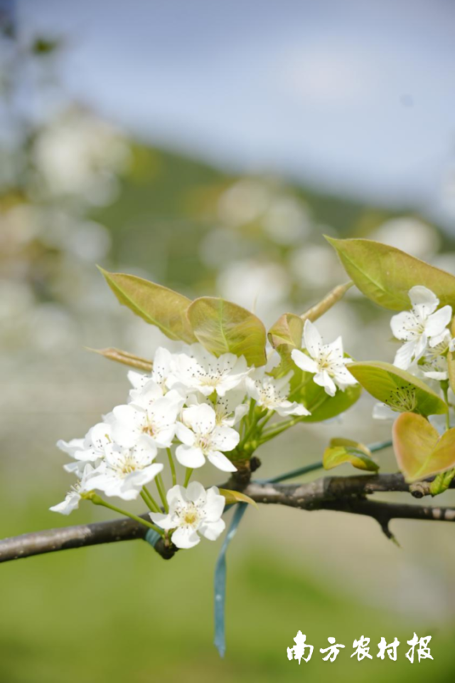 春日来临,清远连州市的水晶梨花开满园。步入连州市龙坪镇水晶梨省级现代农业产业园标准化种植示范基地,数百亩水晶梨花挂满枝头,从远处眺望,漫山梨花宛若团团云絮静待客来。随着“花经济”不断升温,连州正以“花果经济”为载体,培育壮大优势特色产业,吸引游客前来踏青赏花。